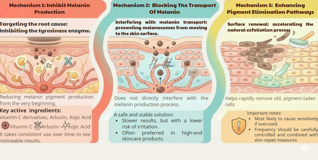 Common skin-whitening mechanisms include:
