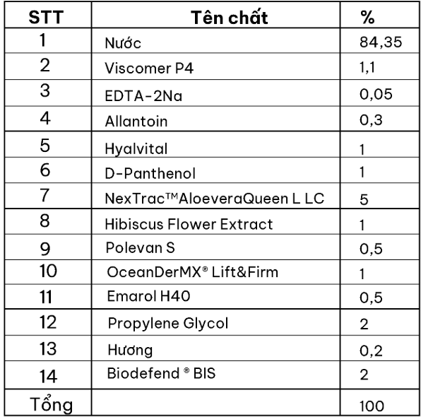 Tên INCI: Aloe Barbadensis Leaf Juice, Sodium Benzoate, Citric Acid, Potassium Sorbate