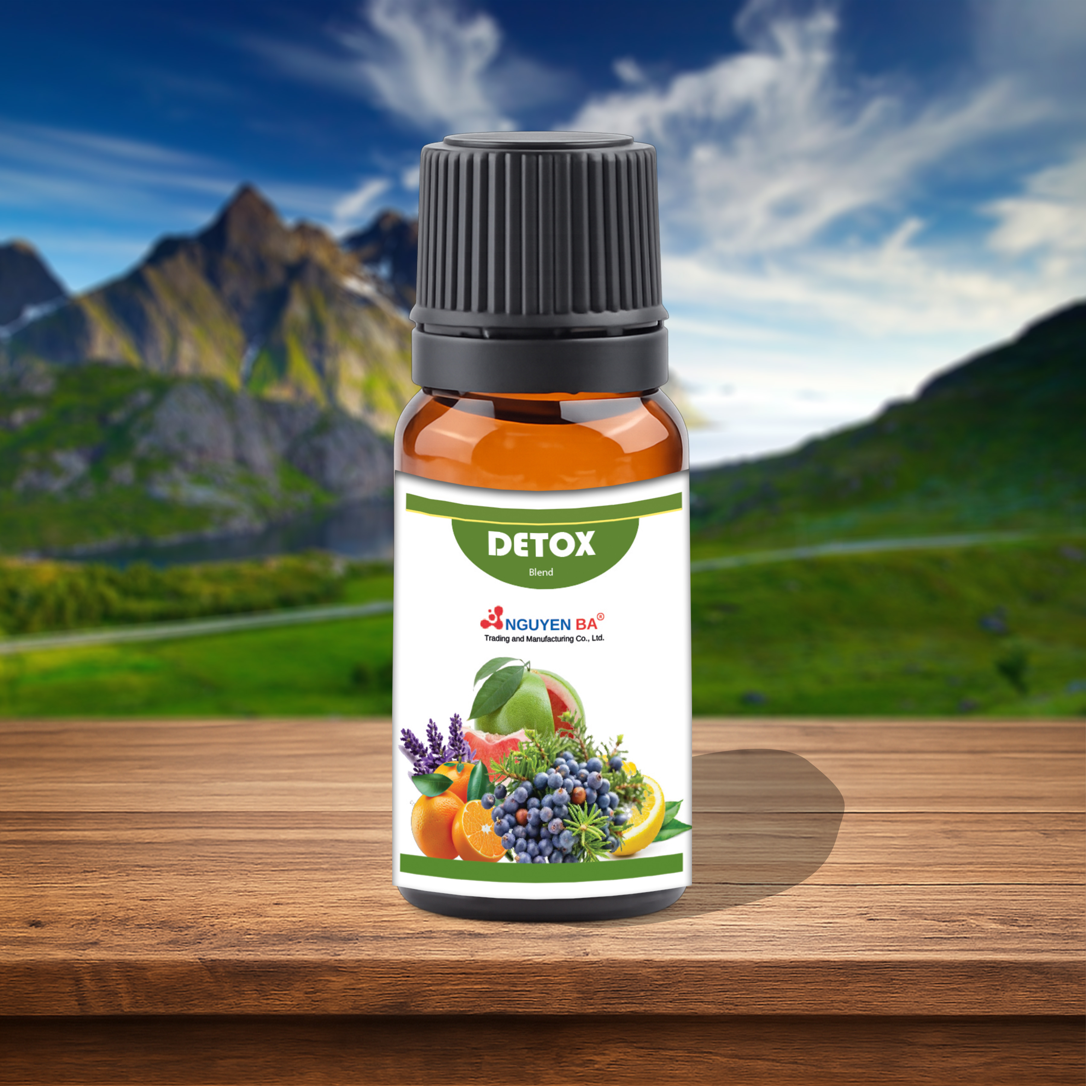 Detox Blend là hỗn hợp các loại tinh dầu bao gồm: Tinh dầu Bưởi, tinh dầu Bách xù, tinh dầu Quýt, tinh dầu Chanh, tinh dầu Hương thảo, tinh dầu Nguyệt quế, tinh dầu Bạc hà. Sản phẩm này mang lại nhiều lợi ích sức khỏe cho cơ thể con người, kết hợp các đặc tính của từng loại tinh dầu riêng lẻ như giảm căng thẳng, lo âu, cải thiện tâm trạng, kháng khuẩn, khử mùi, làm sạch da, giảm mụn trứng cá, cải thiện lưu thông máu,...