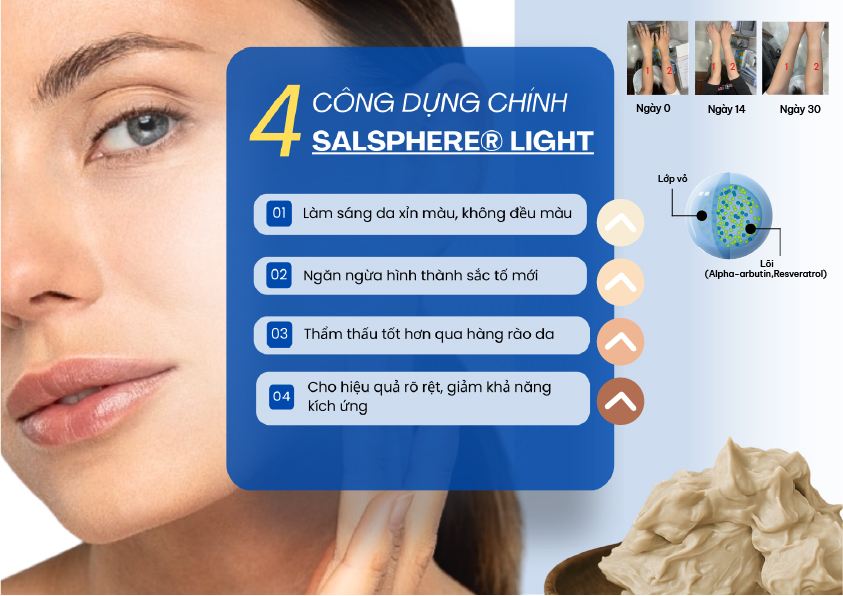 SalSphere® Light được thiết kế để làm đều màu da và điều trị tăng sắc tố da, các đốm đen và nám. α-Arbutin là một lựa chọn thay thế tự nhiên lý tưởng cho hydroquinone. Sự kết hợp của α-Arbutin tự nhiên với polyphenol mạnh mẽ Resveratrol tạo ra một hỗn hợp làm sáng da hiệu quả, mang lại một làn da rạng rỡ.