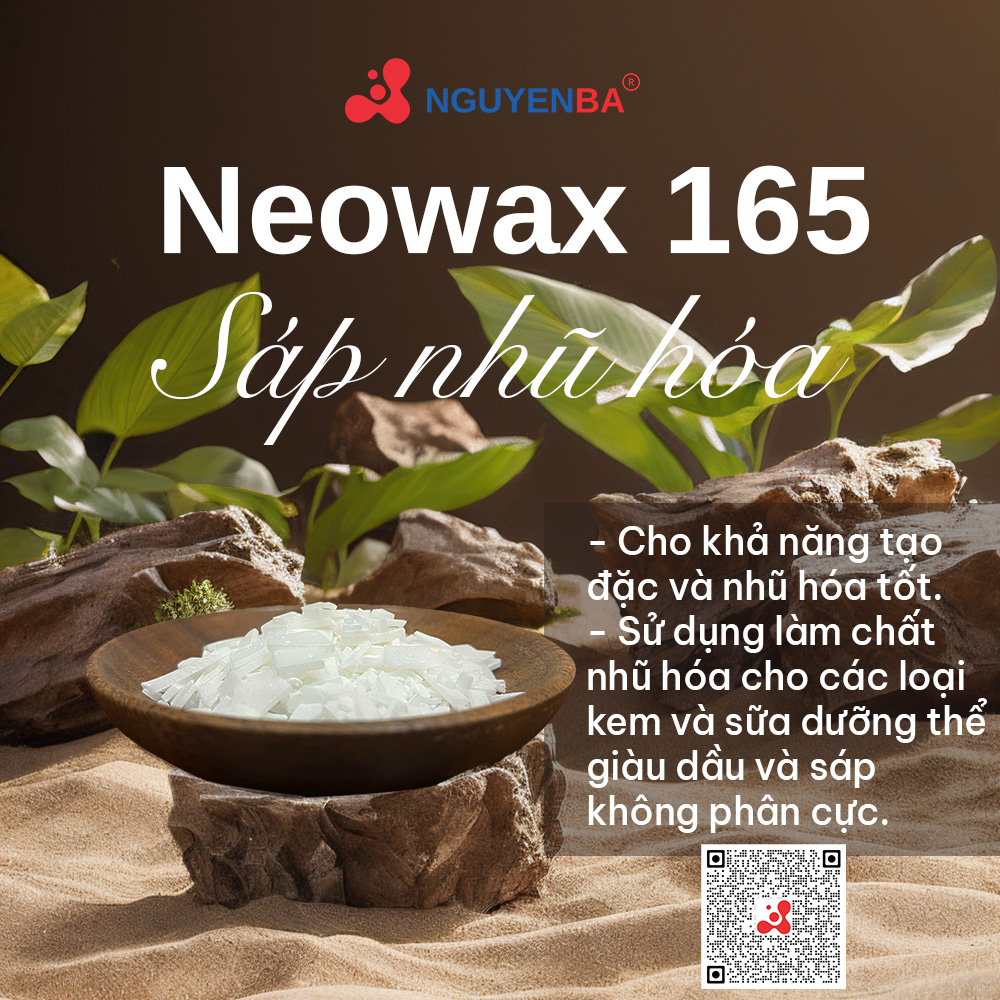 Neowax 165 là hỗn hợp tự nhũ hóa ổn định dựa trên Glyceryl monostearate và PEG100 Stearate. Nó tạo thành nhũ tương có tính ổn định cao và cho cảm giác tuyệt vời khi thoa lên da.