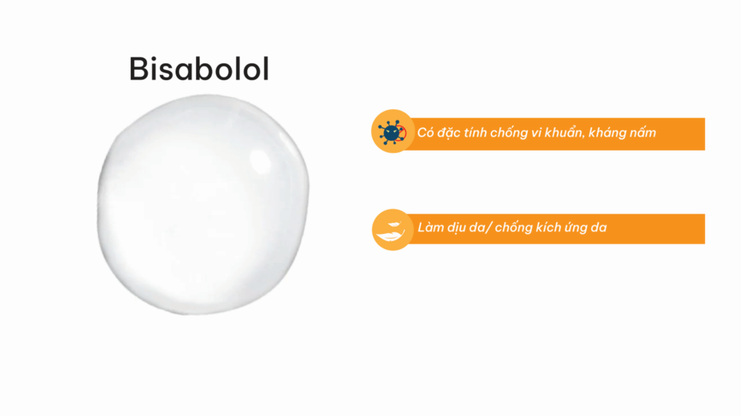 - Bisabolol: Bisabolol là chất chống kích ứng loại tan dầu, cũng có đặc tính chống vi khuẩn, có thể giúp ngăn ngừa và điều trị nhiễm trùng da. Một số nghiên cứu đã xác định rằng bisabolol có đặc tính diệt nấm và diệt khuẩn mạnh đối với một số chủng nấm và vi khuẩn.