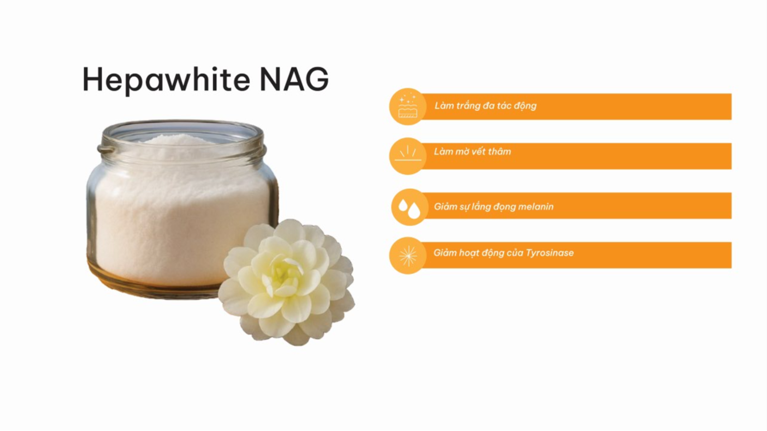 - Hepawhite NAG: là nguyên liệu làm sáng da được phối hợp từ 4 hoạt chất nổi bật: Niacinamide (Vitamin B3), Hydroxyethylpiperazine Ethane Sulfonic Acid (HEPES), Nonapeptide-1 và Ascorbyl Glucoside. Công dụng làm trắng, sáng da – mờ thâm nám theo cơ chế đa tầng, vừa ức chế hình thành melanin, vừa cải thiện bề mặt và nâng tone da.