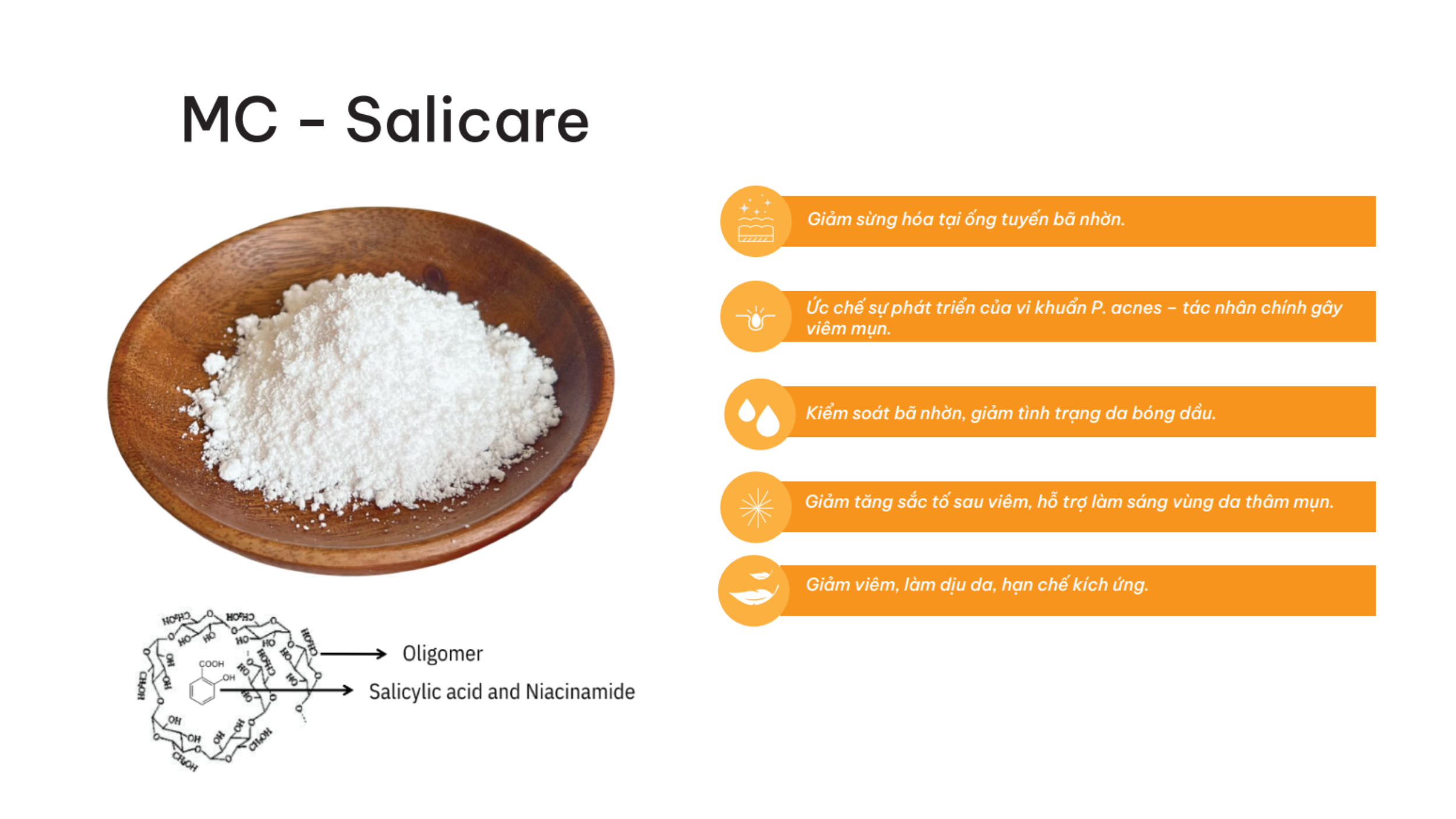 - MC - Salicare: MC-Salicare là sự kết hợp tối ưu khi kết hợp Salicylic Acid với Niacinamide. Nhờ Oligomer bao bọc, Salicylic Acid không còn bị hạn chế bởi vấn đề kết tinh, mà trở nên ổn định, dễ ứng dụng trong nhiều công thức khác nhau.