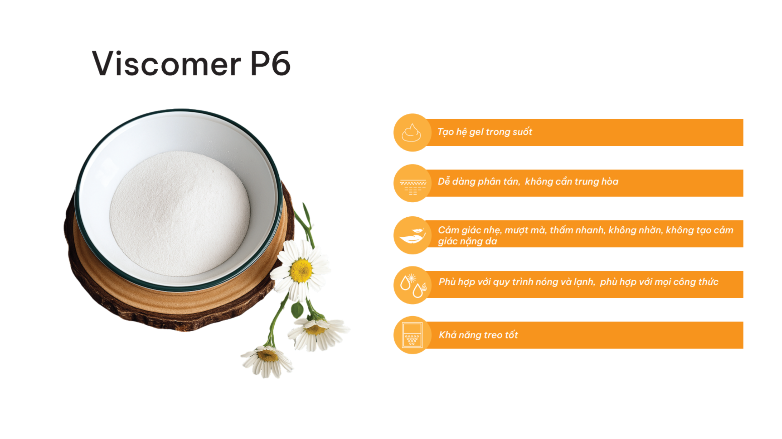 - Viscomer P6: VISCOMER P6 là chất tạo đặc bao gồm các polyme liên kết ngang được phát triển để cung cấp các đặc tính làm đặc, cải thiện kết cấu và ổn định trong các công thức chăm sóc da. Tạo cảm giác mềm mịn, khô thoáng ngay sau khi thoa.