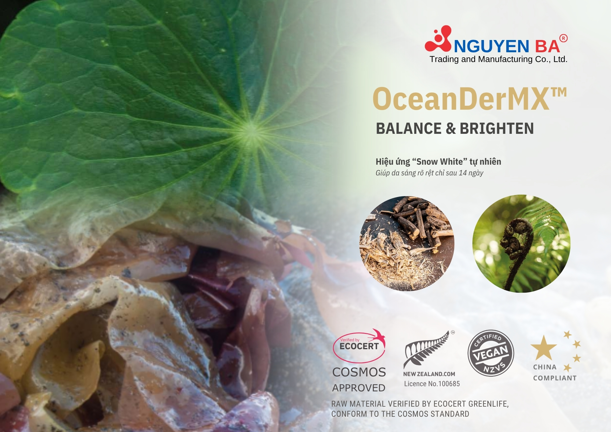 OceanDerMX Balance & Brighten – công thức độc quyền từ New Zealand, kết hợp tảo biển, thảo mộc và rễ cây truyền thống. Kết quả: da sáng khỏe, cân bằng, săn chắc, chống lão hóa. Điểm mạnh của nguyên liệu này nằm ở khả năng đáp ứng nhu cầu “toàn diện & bền vững” cho R&D.