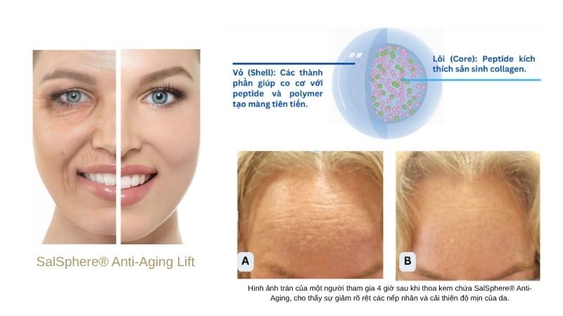 Nắm bắt xu hướng này, SalSphere® Anti-Aging Lift đã được phát triển bằng cách sử dụng công nghệ vi bao, hệ thống này kết hợp Peptide mô phỏng sinh học (GHK-Cu) với Polymer để mang lại tác động kép: vừa tạo ra hiệu ứng nâng cơ và săn chắc tức thì trên bề mặt da, vừa đảm bảo các Peptide được phóng thích có kiểm soát, kích thích sản xuất collagen và cải thiện độ đàn hồi lâu dài.